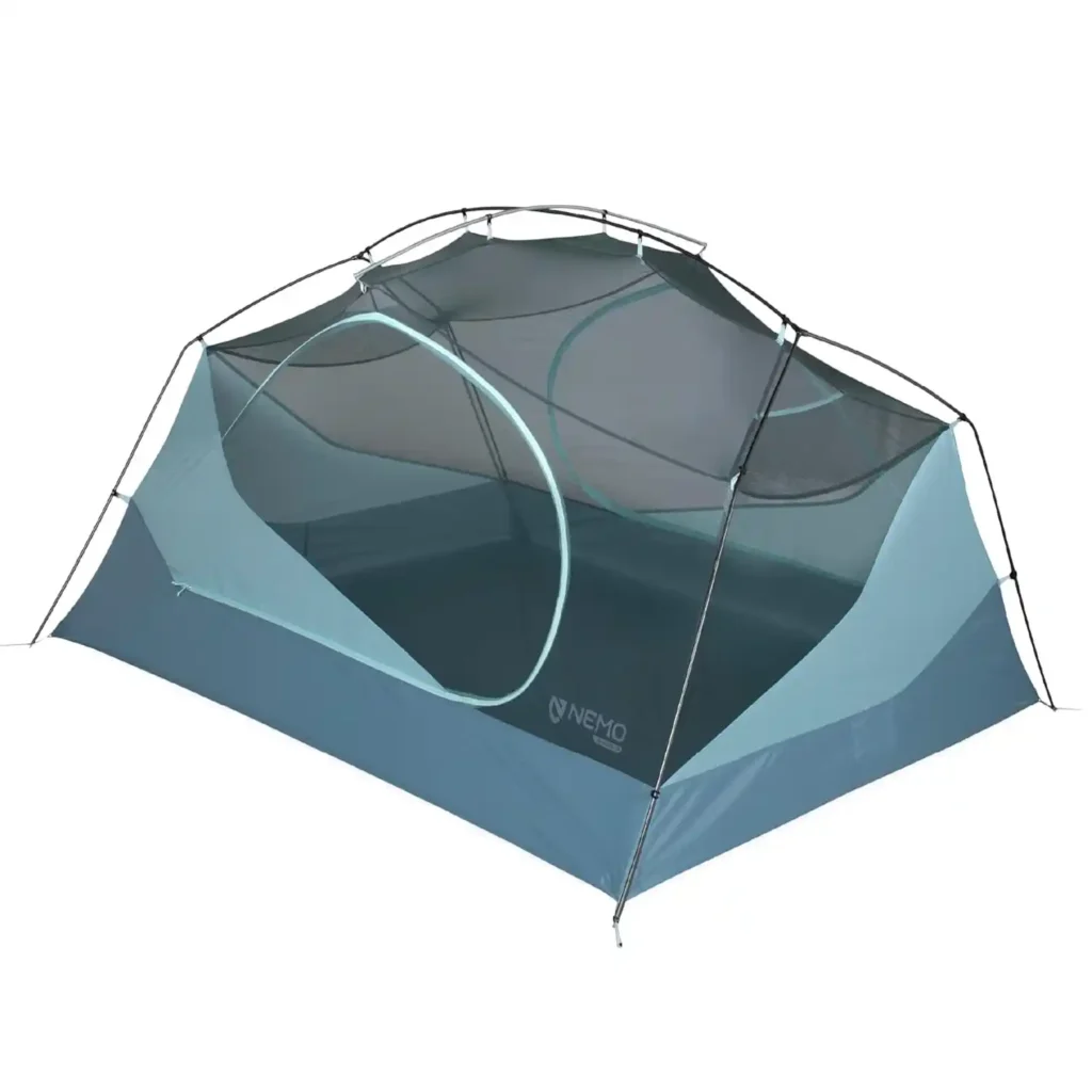 The NEMO Aurora 2 stands out in humid environments because it combines strong ventilation with a noticeably roomier interior than most tents in its class. Large mesh panels allow moist air to escape instead of lingering around sleeping height.